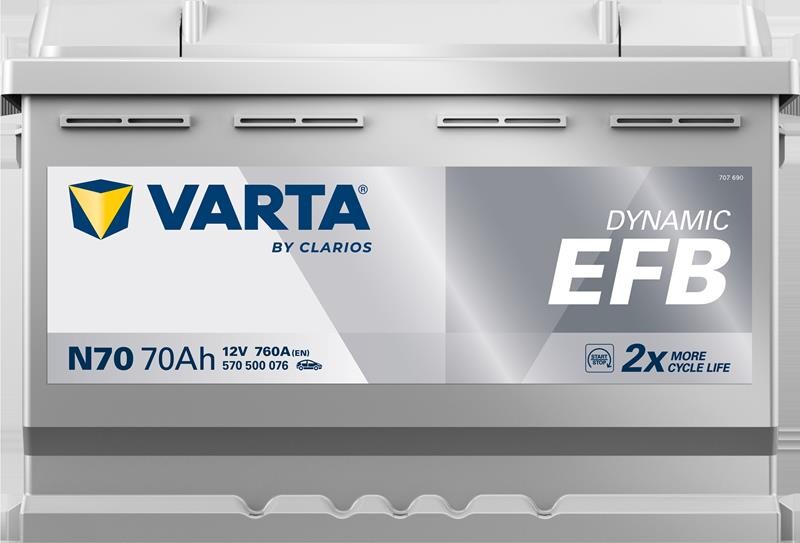 12V battery from Varta's Blue Dynamic EFB series with a capacity of 70Ah and measures 278x175x190mm. Blue Dynamic EFB series is the starter battery for cars with basic start/stop function. This battery has approximately 2 times the lifespan than a standard starter battery when used in this type of vehicles. The battery is maintenancefree. If an even better experience it is possible to exchange the EFB battery with an AGM version from the Dynamic Silver AGM series. Priamrely used in vehicles with basic start/stop function.